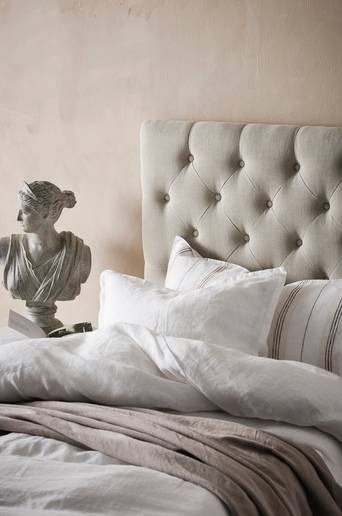 Fristående gavel klädd med linne och djuphäftade klädda knappar. Skapa hotellkänsla i sovrummet med en djuphäftad sänggavel i finaste linne. Väggfästen medföljer. Material: 100% lin, trästomme och skumgummifyllning. Storlek: Bredd 90 cm. Höjd 122 cm. Djup 10 cm. Skötselråd: Torkas med fuktig trasa. Tips/råd: Förutom bekvämt stöd för ryggen får du ett mjukare intryck med en stoppad sänggavel. Gaveln behöver ingen montering, ställ den bara mellan säng och vägg.