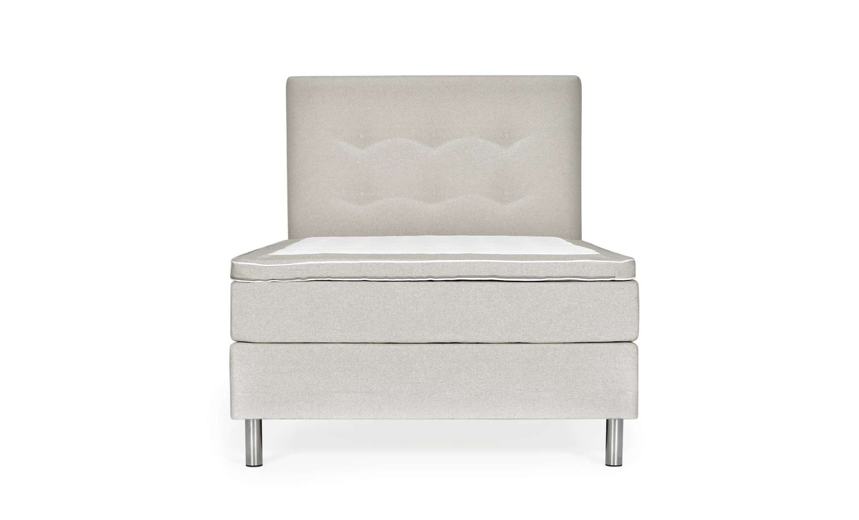 Komplett sängpaket som inkluderar Ängelholm Deluxe 140 Fast Beige och Ängelholm 140 Sänggavel Beige. Ängelholm är en härlig kontinentalsäng i högsta kvalitet med hög komfort, vilket nås via dess tre madrasser och stadiga grund. Både sänggaveln och sängen är klädda i textil tillverkat av återvunnet material. Gaveln dekoreras av pickering som både ger gaveln ett djup och vackert mönster. Med dess klassiska design och utbud av flera olika färger och storlekar, kommer Ängelholm alltid vara rätt val för dig.Design & komfortÄngelholm har en fast komfort, men exakt hur komforten upplevs är dock väldigt individuellt och beror på vikt samt kroppsform. Bäddmadrassen har en kallskumskärna omsluten av mjukt vadd och har en tjocklek på 7 cm. Mellanmadrassen, som är 17 cm tjock, är av kallskum och har 5zon-flex pocketfjädring som anpassar sig efter din kropp och ger bra avlastning. Resårmadrassen är 23 cm tjock och har ett bonellfjädersystem, vilket ger sängen en god stabilitet. Sängen har en massiv träram, vilket ger stadga och god hållbarhet.Sängbenen är tillverkade av silverfärgad metall och monteras med en M8-bult. Sänggaveln har en stomme av massivt trä.Gaveln står på 2 cm höga ben utav svart plast. Monteras enkelt mellan säng och vägg. Tyg & skötselResårmadrassen, mellanmadrassen och sänggaveln är klädda i slitstarkt tyg av 70% bomull och 30% polyester.Tyget är helt tillverkat av garn som är av återvunnet material. Exempelvis har gamla PET-flaskor och kläder fått ett nytt liv genom att återvinnas och används i detta tyg.Tygvikt 504g/m2, martindale 25 000, pilling 4/5, ljusfasthet 4/5Bäddmadrassens sidor täcks av samma material som resterande säng medan mitten kläs av mjukt jerseytyg.Bäddmadrassen och mellanmadrassen har en avtagbar klädsel som tas av med hjälp av en dragkedja. Klädseln kan maskintvättas i 30 grader, vänd gärna tyget ut och in. Får ej torktumlas eller strykas. Vi rekommenderar att torka dessa hängandes.Resårmadrassen och sänggavelns klädsel är ej avtagbara. Vi rekommenderar att impregnera denna med textilskydd och använda textilrengöring vid fläckar.Leverans & förpackningSängen levereras delvis monterad för enklare transport och hanteringGaveln levereras monterad.Antal förpackningar: 2 stFörpackningsmått: 217x140x60 cm / 144x129x13 cmVikt: 75 kg / 25 kgNotera att extrabilderna visar sängen i färgen ljusgrå.