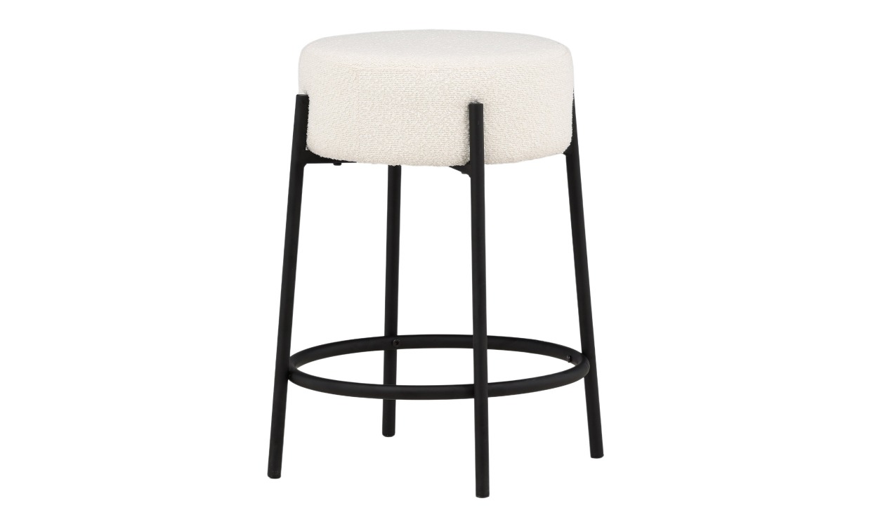 Benita är en stilren barstol som kombinerar modern design med hög komfort. Den cylinderformade sitsen i vitt bouclét tyg ger en mjuk och inbjudande känsla medan benen i svart stål med fotstöd erbjuder stabilitet och extra komfort. En barstol som gör sig lika bra vid bardisken i köket som vid ett högre matbord.Design & komfortStilren barstol med modern design och hög komfort. Stolen är 50 cm bred, 60 cm hög och 50 cm djup.Sitthöjden 60 cm.Stolen klarar en maxvikt på 150 kg.Material & skötselStolen är tillverkad i svartlackerad stål och en sits i mjukt och slitstarkt bouclét tyg.Rengör tyg med en lätt fuktad trasa och undvik starka rengöringsmedel.