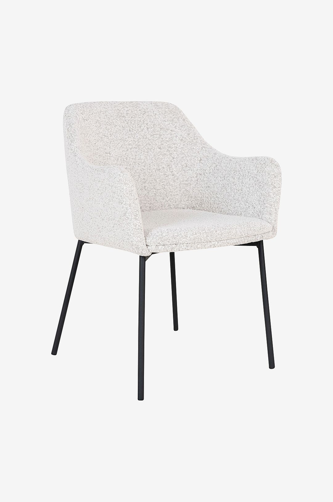 Matstol, vit bouclé med svarta ben. Måttet från golv till armstöd är 65 cm.