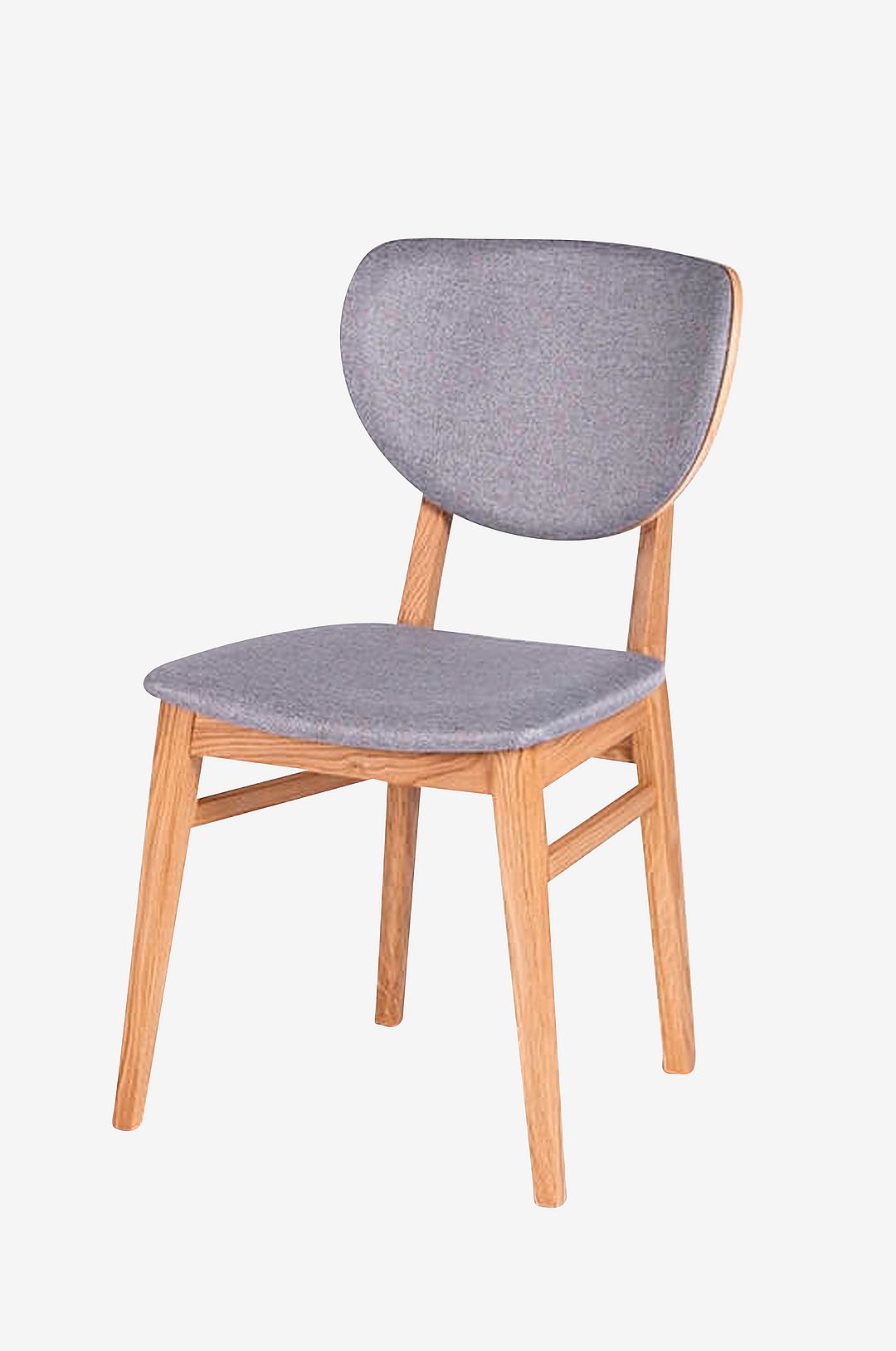 Stolen i massiv ek andas skandinavisk design och har en stoppad sits och ryggbricka av slitstarkt grått tyg. Den rundade ryggbrickan gör trästolen väldigt bekväm,perfekt för matplatsen.