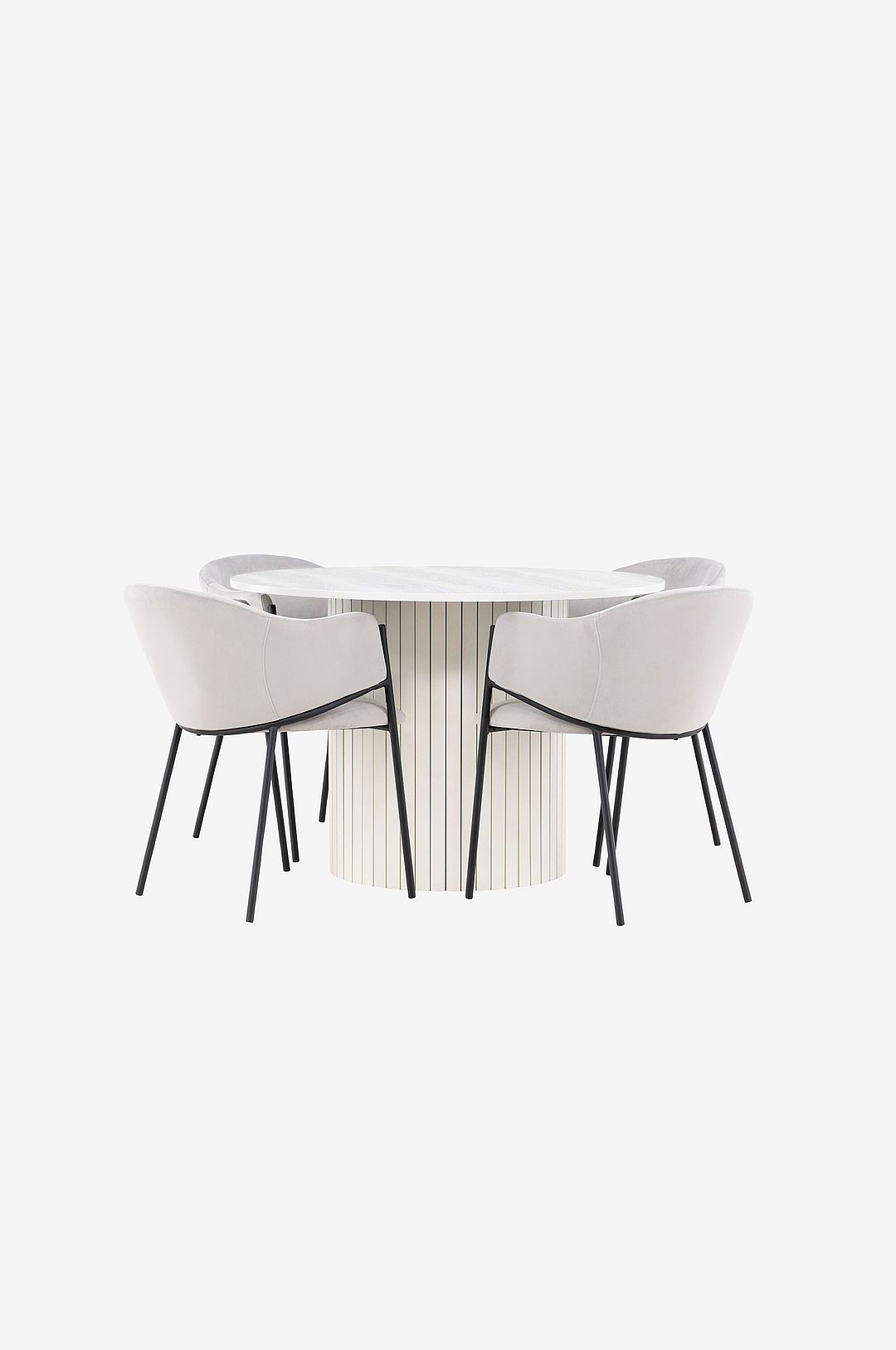 Skapa en elegant och inbjudande matplats med vår eleganta matgrupp som kombinerar det moderna bordet Häron med de bekväma stolarna Evelina. Denna matgrupp är perfekt för både vardagsmiddagar och festliga tillfällen och ger din matsal en sofistikerad och modern känsla. Häron-bordet, som är tillverkat av mdf, har en finish som ger en ljus och fräsch atmosfär till din matsal. Med en diameter på 110 cm erbjuder bordet gott om utrymme för mat och samtal, samtidigt som dess runda form skapar en harmonisk och balanserad miljö. Bordets robusta konstruktion garanterar långvarig användning och stabilitet. De fyra evelina-stolarna kompletterar bordet perfekt med sina eleganta sitsar. Dessa stolar erbjuder både komfort och stil, vilket gör dem idealiska för långa, trevliga middagar med familj och vänner. Deras moderna design med höga ryggar och mjuka sitsar ger din matsal en sofistikerad och modern touch. Denna matgrupp är en perfekt blandning av estetik och funktionalitet, vilket gör den till ett utmärkt val för dig som vill ha en elegant och bekväm matplats. Uppgradera din matsal med kombinationen häron bord och evelina stolar, och skapa en plats där minnen och glädje delas.