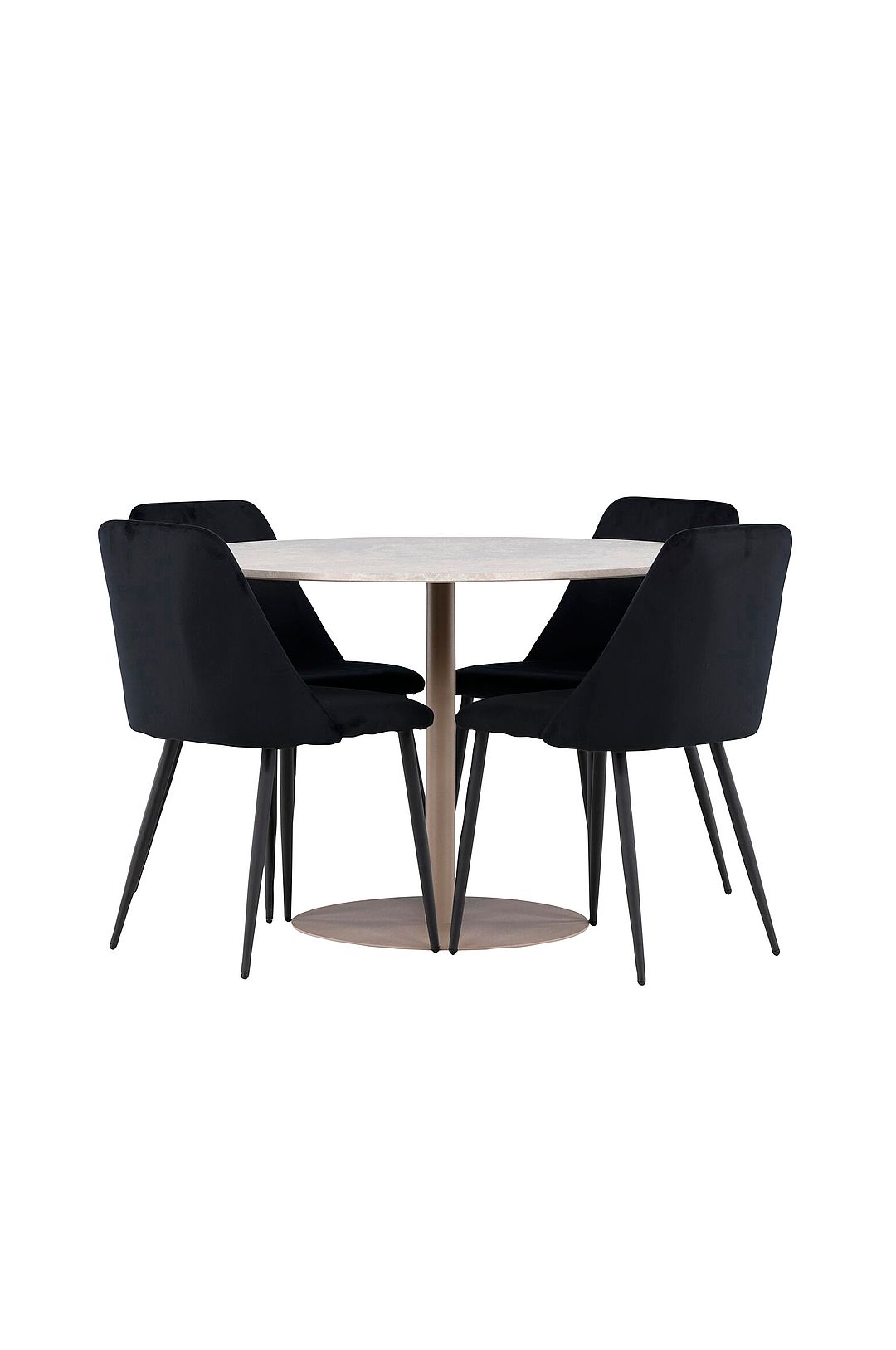 Skapa en modern och sofistikerad atmosfär i din matsal med vår exklusiva matgrupp bestående av Lycke-bordet och nattstolarna. Denna matgrupp kombinerar elegant design med hög komfort, vilket gör den till en vacker mittpunkt i ditt hem. Lycke-bordet imponerar med sin eleganta mdf-konstruktion. Med en diameter på 110 cm erbjuder bordet gott om utrymme för måltider och sammankomster, samtidigt som dess harmoniska design ger en lugn och inbjudande känsla till din matsal. Den slitstarka ytan är lätt att rengöra och underhålla, vilket garanterar långvarig skönhet och funktionalitet. De fyra medföljande nattfåtöljerna kompletterar bordet perfekt. Dessa stolar är klädda i lyxig sammet, vilket ger en mjuk och inbjudande sittupplevelse. Sammetstyget är känt för sin elegans och komfort, vilket gör att du och dina gäster kan sitta bekvämt under långa middagar och samtal. Stolarna skapar en snygg kontrast mot bordet, vilket ger din matsal en modern och sofistikerad atmosfär. Lycke matgrupp med nattfåtöljer är det perfekta valet för dig som vill skapa en elegant och funktionell matsalsmiljö. Kombinationen av modern design och hög komfort gör varje måltid till en njutbar upplevelse. Välkommen till en ny nivå av stil och komfort i ditt hem med lycke och night!