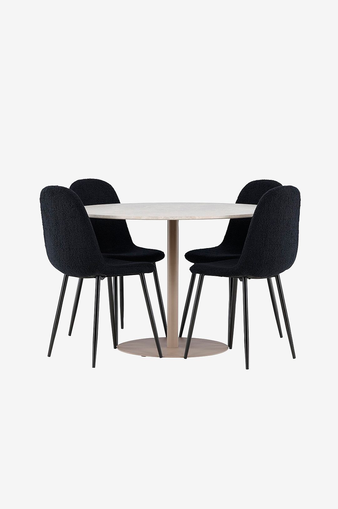 Förvandla din matsal med den eleganta och moderna matgrupp som består av Lycke-bordet och Polar-stolarna. Denna matgrupp är utformad för att kombinera stil och komfort, vilket gör den till ett fantastiskt komplement till ditt hem. Lycke-bordet är en imponerande mittpunkt med sin sofistikerade design och mdf-konstruktion. Med en diameter på 110 cm erbjuder bordet gott om utrymme för måltider och sociala sammankomster, samtidigt som den harmoniska designen ger en modern och elegant touch till din matsal. Den slitstarka ytan gör bordet lätt att rengöra och underhålla, vilket säkerställer dess långvariga skönhet och funktionalitet. De fyra medföljande polarstolarna kompletterar bordet perfekt. Stolarna är klädda i mjuk polyesterteddy, vilket ger en lyxig och bekväm sittupplevelse. Teddymaterialet är känt för sin värme och mjukhet, vilket gör att du och dina gäster kan sitta bekvämt under långa middagar och samtal. Benen på stolarna ger en stabil konstruktion samtidigt som de förstärker stolarnas moderna och eleganta utseende. Lycke matgrupp med polarstolar är det perfekta valet för dig som vill skapa en snygg och funktionell matmiljö. Kombinationen av modern design och hög komfort gör varje måltid till en njutbar upplevelse. Välkommen till en ny nivå av stil och komfort i ditt hem med lycke och polar!