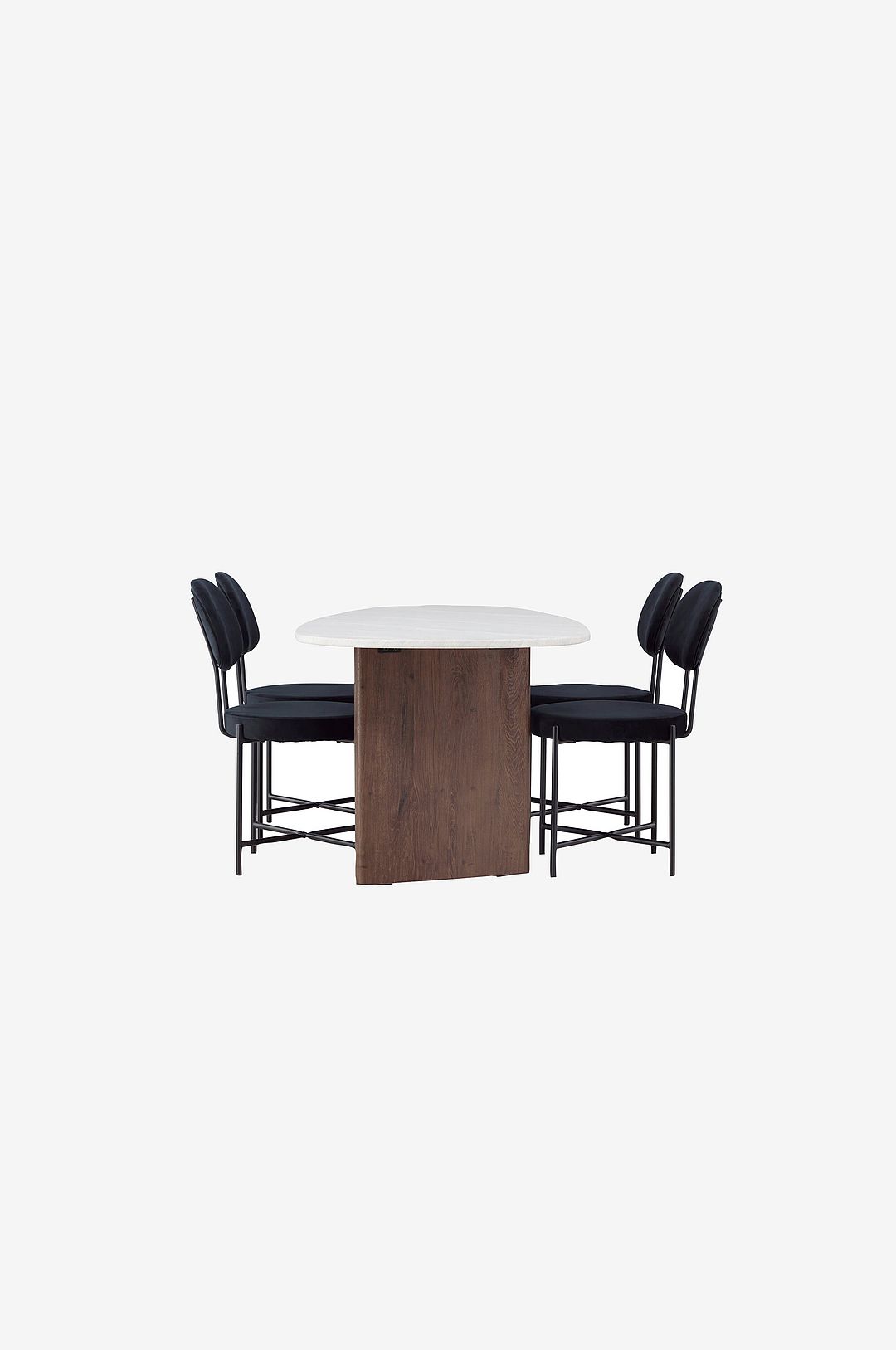 Skapa ditt dröm-hem med den här moderna matgruppen i skandinavisk stil och personlig design! här får du en snygg och bekväm matgrupp till alla festliga tillfällen. Matbordet grönvik har en oregelbunden bordsskiva i vacker mdf med betong-look som bidrar till ett unikt blickfång. Stommen består av två tunna träskivor i trendig kulör som ger ett stadigt stöd åt bordet, vilket garanterar långvarig hållbarhet och stabilitet. Här tillsammans med matstolar från serien stella. Den här matstolen i sammetstyg erbjuder en trendig, skandinavisk design med en rund sits och stolsrygg i lyxigt sammetstyg. njut av måltider med familj och vänner vid detta fantastiska bord och känn hur den skandinaviska touchen omsluter dig. En personlig matgrupp som kommer bli din favoritplats i hemmet framöver!