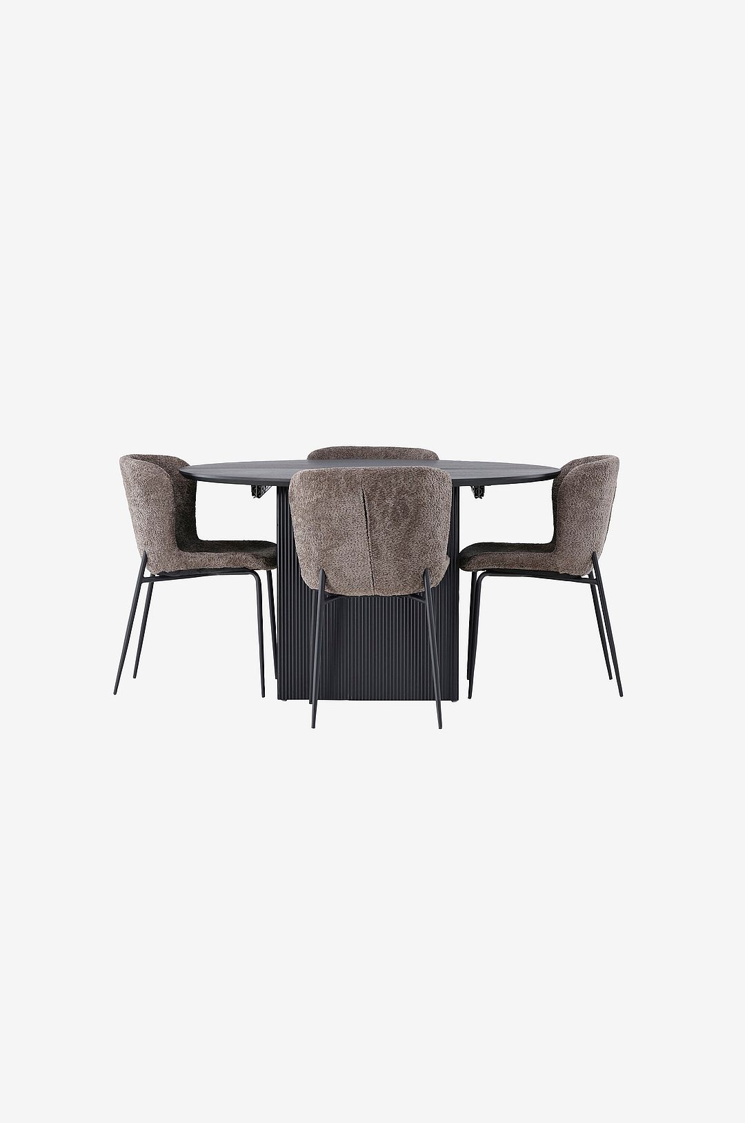 En smart matgrupp med fokus på stil, komfort och genomtänkt design som står sig över tid! det runda matbord matilda är den perfekta lösningen för ditt hem. Bordet har en rund toppskiva i mdf med faner, som inte bara är lätt att rengöra, utan också ger en sofistikerad touch till din matplats. De två klossformade benen ger bra stabilitet och skapar en modern stil. Det bästa med matilda är dess förlängningsbara funktion som förvandlar den runda bordsskivan till ett ovalt bord när du har fler gäster på besök. Du behöver inte längre oroa dig för trängsel. Matilda ger dig flexibiliteten att anpassa matplatsen efter dina behov! tillsammans med det förlängningsbara matbord matilda kommer våra stilrena matstolar från modesto-serien. Denna skandinaviskt inspirerade matstol i mjukt bouclétyg och ben i metall ger en inbjudande atmosfär till hemmets hjärta. Den lätt rundade ryggen och den stoppade sittdynan erbjuder fantastisk komfort, vilket gör att du kan njuta av långa och trevliga måltider med vänner och familj! Vad mer kan man önska? Här får du en smart matgrupp som anpassar sig till dina behov och önskemål!