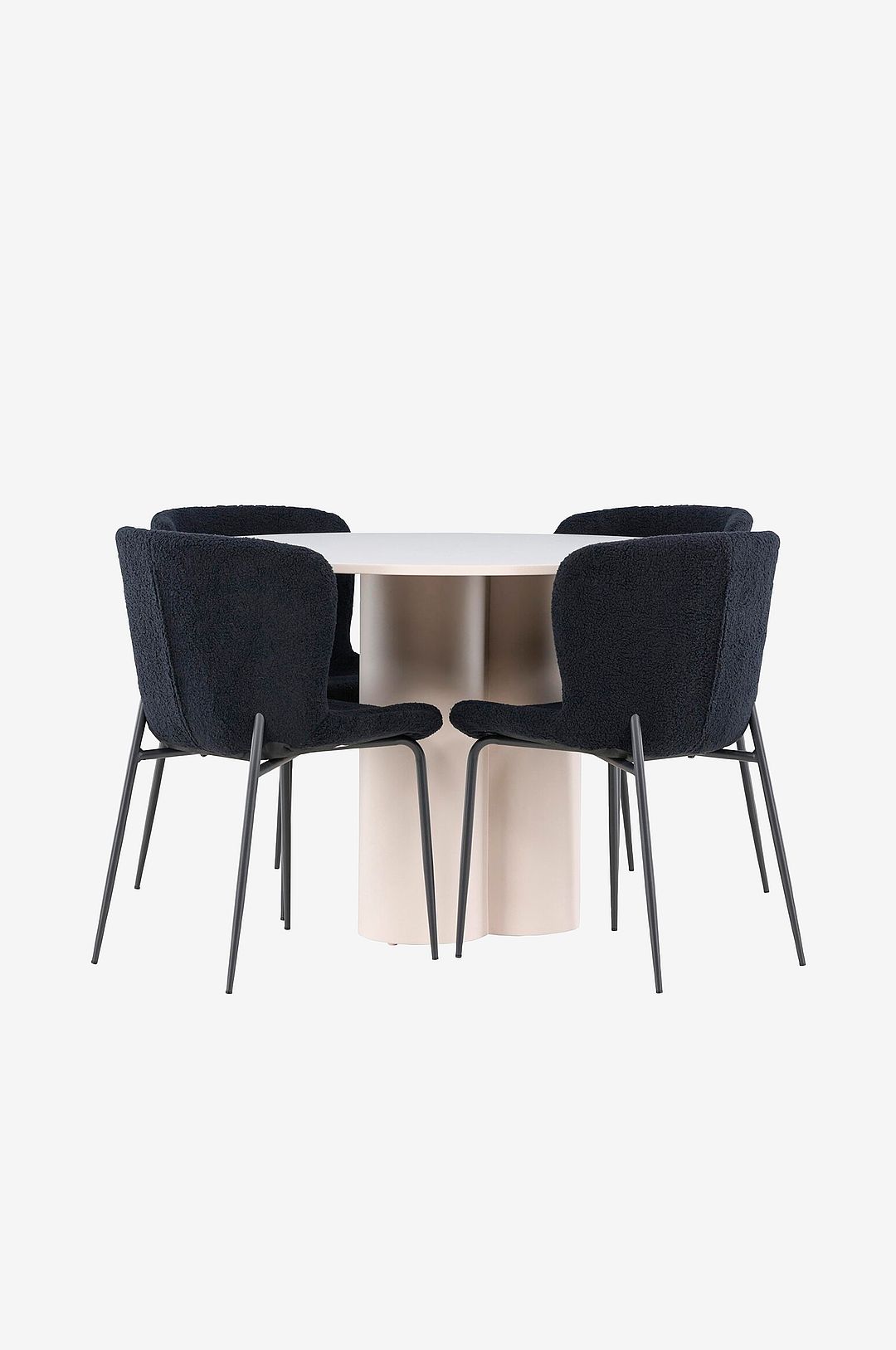 Skapa en elegant och inbjudande matplats med vår sofistikerade matgrupp som kombinerar olivia-bordet med de eleganta modesto-stolarna. Denna matgrupp är perfekt för både vardagliga middagar och festliga tillfällen och ger din matsal en modern och harmonisk atmosfär. Bordet olivia är tillverkat av mdf och ger en varm och inbjudande känsla till din matsal. Med en diameter på 110 cm erbjuder bordet gott om utrymme för mat och samtal, samtidigt som dess runda form skapar en balanserad och social miljö. Bordets robusta konstruktion garanterar långvarig användning och stabilitet. De fyra Modesto-stolarna kompletterar bordet perfekt med sina eleganta sitsar klädda i polyesterteddy. Stolarna erbjuder både komfort och stil, vilket gör dem idealiska för långa, trevliga middagar med familj och vänner. Deras moderna design med höga ryggstöd och mjuka sitsar ger din matsal en sofistikerad och modern touch. Den här matgruppen är en perfekt kombination av estetik och funktionalitet, vilket gör den till ett utmärkt val för dig som vill ha en elegant och bekväm matplats. Uppgradera din matsal med en kombination av olivia-bordet och modesto-stolarna och skapa en plats där minnen och glädje delas.