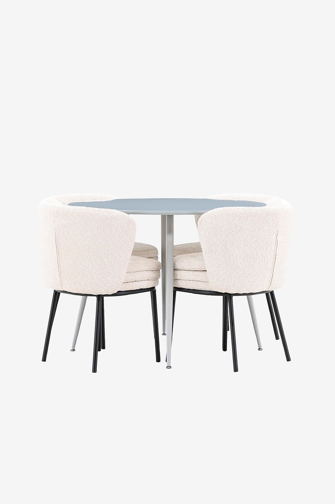 Förnya din matsal med den sofistikerade och eleganta matsalsuppsättningen som inkluderar bordet plaza och stolarna agnes. Denna matgrupp kombinerar modern design med högsta komfort och är det perfekta tillskottet till ditt hem. plaza-bordet imponerar med sin eleganta finish och robusta mdf-konstruktion. Med en diameter på 100 cm erbjuder det en generös yta för måltider och sammankomster, samtidigt som det behåller en kompakt storlek som passar perfekt i både små och stora rum. Finishen ger bordet ett modernt och sofistikerat utseende, och den slitstarka ytan gör det enkelt att rengöra och underhålla. de fyra medföljande agnes-stolarna är en perfekt matchning till bordet med sin moderna och eleganta design. Stolarna är klädda i mjuk bouclé, vilket ger en lyxig och bekväm sittupplevelse. Bouclétyget är känt för sin struktur och mjukhet, vilket gör att du och dina gäster kan sitta bekvämt under långa måltider och trevliga samtal. Stolarna skapar en vacker kontrast mot bordet och ger din matsal en fräsch och inbjudande atmosfär. plaza matgrupp med agnes stolar är det perfekta valet för dig som vill kombinera stil med funktionalitet. Skapa en plats där du kan njuta av måltider, umgås med vänner och familj och skapa bestående minnen. Välkommen till en ny nivå av elegans och komfort i ditt hem med plaza och agnes!