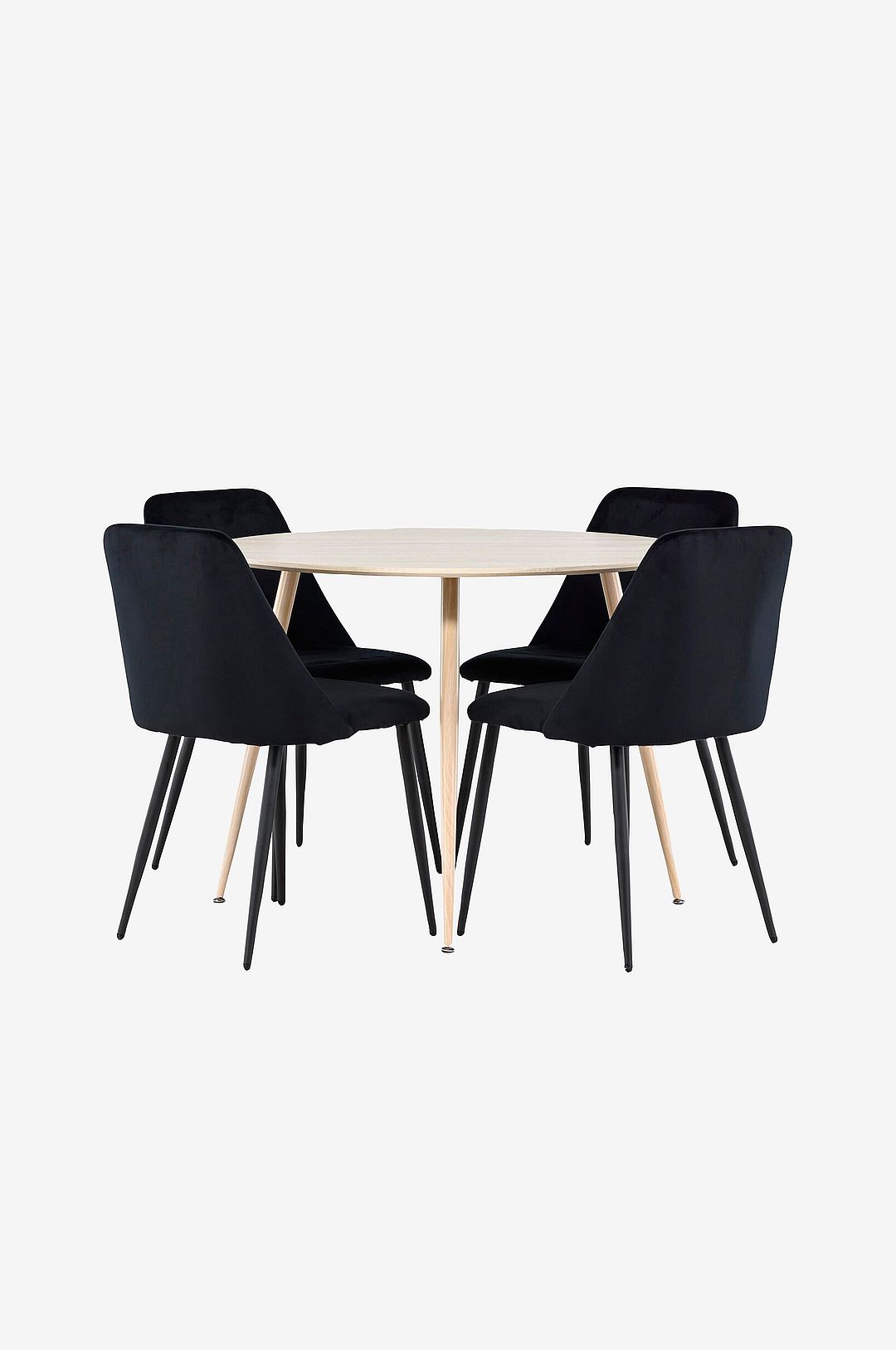 Upptäck den perfekta matsalsuppsättningen för ditt hem med matbordet plaza och matstolarna night. Matbordet plaza, med en generös diameter på 100 cm, är tillverkat av slitstarkt mdf-material och har en vitpigmenterad yta som ger rummet en varm och inbjudande känsla. Den moderna designen och de rena linjerna skapar en lugn och harmonisk atmosfär som gör varje måltid till en avkopplande upplevelse. Det kompakta formatet gör plaza perfekt för mindre utrymmen samtidigt som det erbjuder tillräckligt med utrymme för bekväma måltider med familj och vänner. Komplettera ditt matbord med night dining-stolar, som erbjuder både komfort och stil. Stolen har en helklädd sits i sammetstyg och stolsben i matchande färg, vilket skapar ett lyxigt skimmer i rummet. Night dining-stolarna bidrar till en inbjudande och modemedveten atmosfär som gör det extra trevligt att slå sig ner för en god måltid. Den sofistikerade designen och det bekväma materialet gör Night till det perfekta valet för både vardagliga middagar och festliga tillfällen. Ge ditt hem en touch av modern elegans med plaza matbord och night matstolar – en perfekt kombination för alla som värdesätter både stil och funktion i sin inredning.