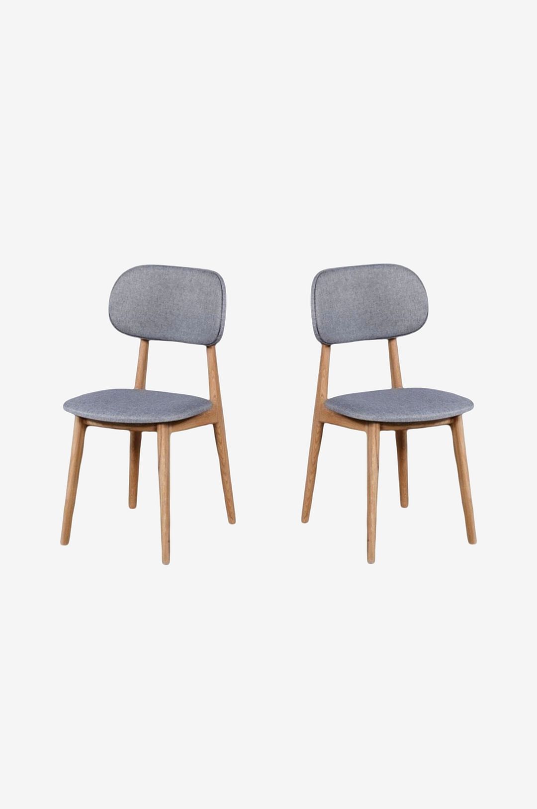 Snyggt set med två stolar. Klädda stolar i ljusgrått tyg. Skandinavisk design, hög kvalitet, tillverkad av massiv ek och plywood, helt monterad på fabriken. Maximal belastning 110 kg. tyg malmo: Vikt m 2- 220g/m² +/-10%. sammansättning: 100% polyester martindale-test 25000-30000 trådförskjutning, 3,1-3,4 mm varp / 3,8-4,2 mm väft tendens till pilling och pilling: 5 gnuggningstålighet torr: 5 gnidningstålighet våt: 4-6