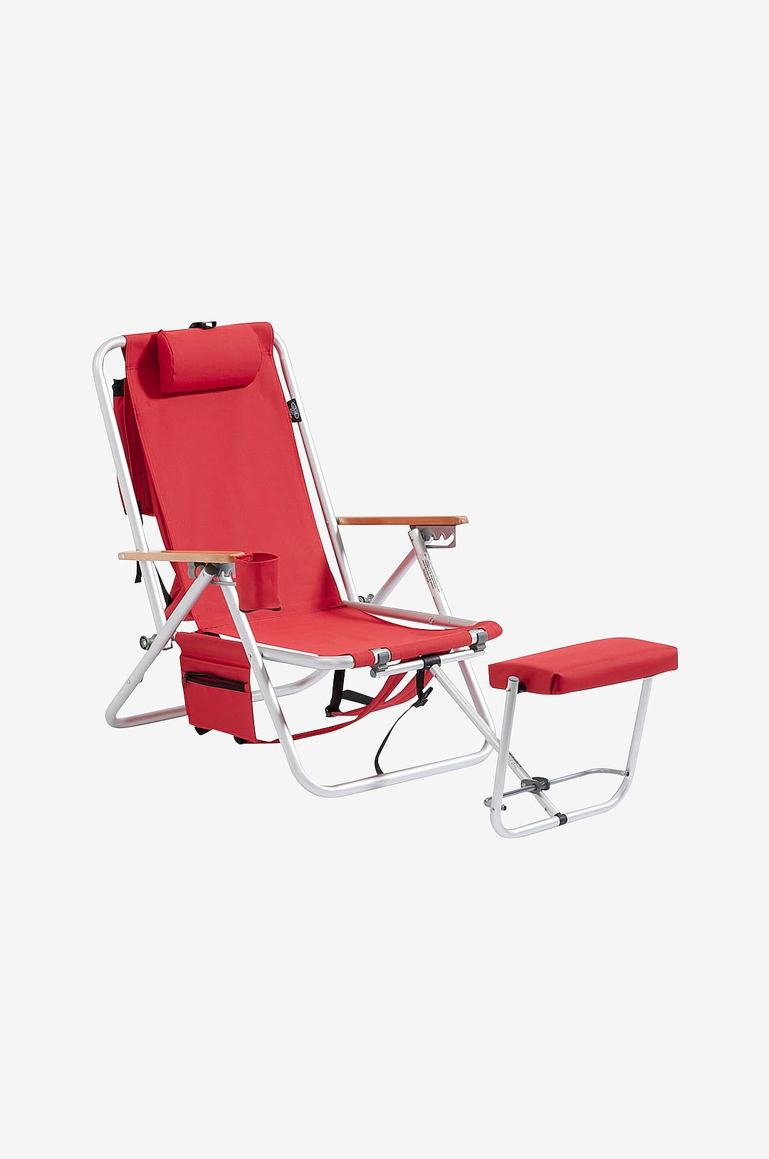En utomhusstol med trähandtag, justerbar rygg, ryggsäck och fotpall. Denna modell är utökad med en kylväska och ficka för mobiltelefon. Fotpallen kan enkelt vändas och användas som ett litet bord. Material: alumnium och polyester. Maximal vikt: 110 kg