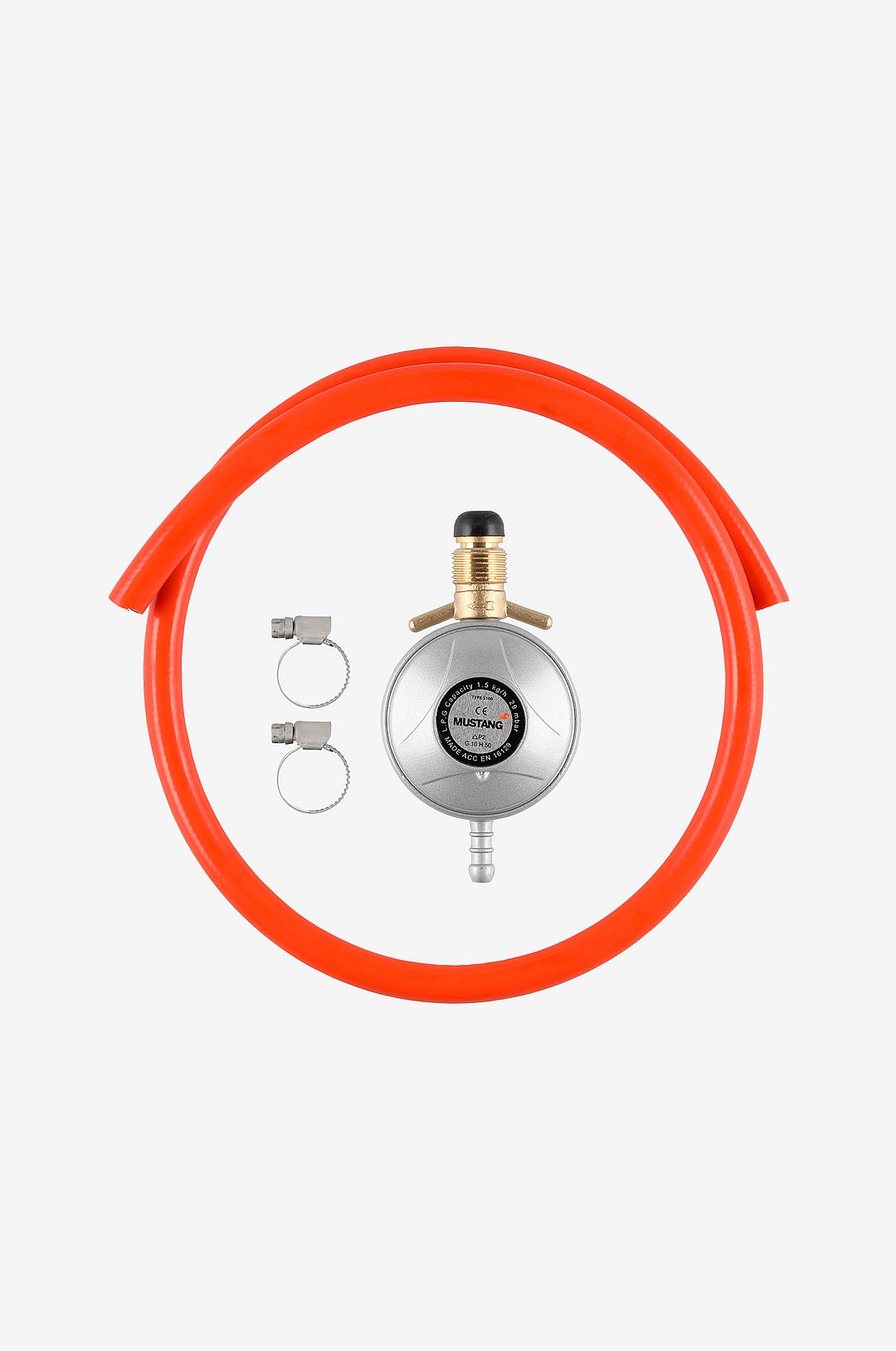 Säkerhetskoppling till gasolgrillar för Sverige med anslutningstryck 30 mbar. – Anslutningstryck 30 mbar – Slang 1 m – 2 st slangklämmor