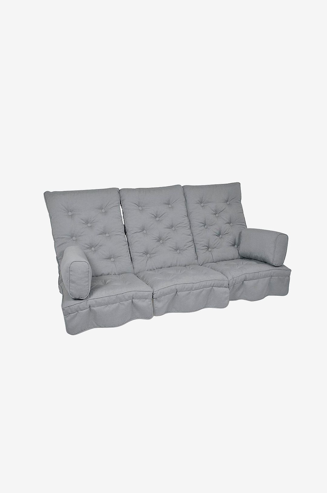 Dynorna är tillverkade av stark dralon/akryl (90%) och linnetextil (10%) med en miljövänlig beläggning som gör dynorna vattenavvisande. Flockvadderad och boxsydd, inkl. sidokuddar, 8cm tjocka material: fyllning: hel polyeterkärna omlindad med fibervadd skal: 90% dralon, akryl/10% linne tvättråd: möbeltvätt mått: 56x78x50cm oeko-tex certifierad standard 100