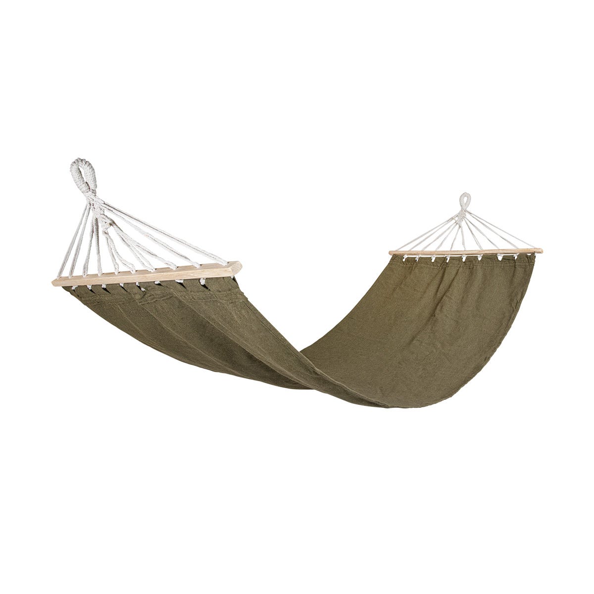Khakigrön och stilren hängmatta. Den perfekta presenten till vårfesten, eller till dig själv! Enkel att flytta runt eller att ta med sig. Hängmattan är tillverkad av slitstarkt och tåligt polycotton, vilket är en blandning av 70% bomull och 30% polyester. Maxvikt: 120 kg.