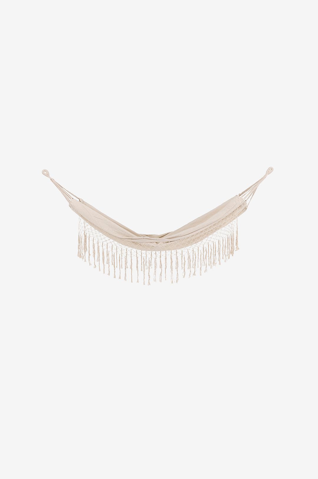 En hammock skapar snabbt en inbjudande och rofylld atmosfär i din trädgård! Benate erbjuder dig en hammock som du gärna kryper upp i och njuter av stillsam tid. Tillverkad i bomulls- och polyestertyg i en smäcker vit kulör som bärs upp av slitstarka rep i samma färg. Hammocken har även dekorativa fransar som hänger ned längs sidorna. Här kan du gunga, läsa och njuta av lugn och ro! Mått: bredd: 150 cm, längd: 200 cm