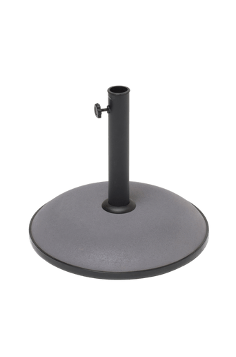 Parasollfot i grå betong. Plasthylsor i röret gör att diametern kan justeras mellan 30-40 mm. Plastlisten gör att betongfoten kan förflyttas med mindre risk för repor.