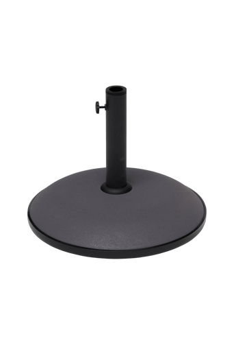 Parasollfot i grå betong. Plasthylsor i röret gör att diametern kan justeras mellan 30 och 40 mm. Plastlisten gör att betongfoten kan förflyttas med mindre risk för repor.