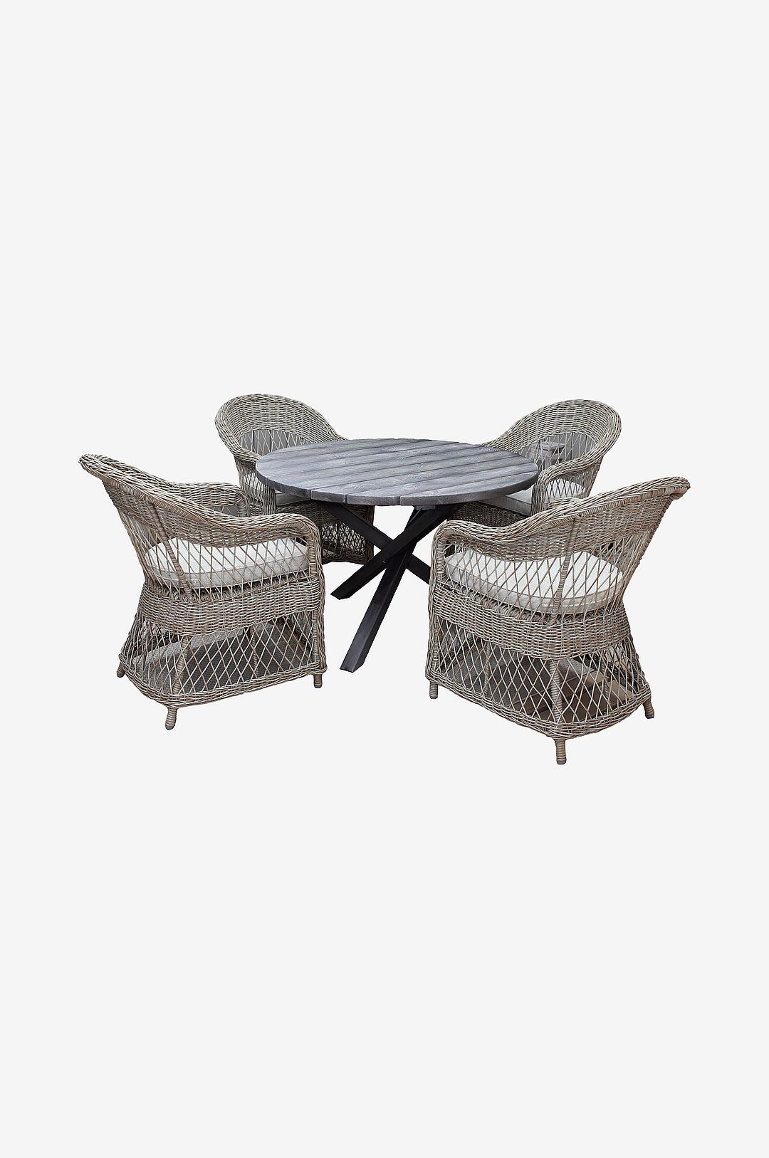 LifestyleGarden – Bord Ø 112 cm & 4 st Marbella-stolar – Grå – Matgrupper – Från Homeroom