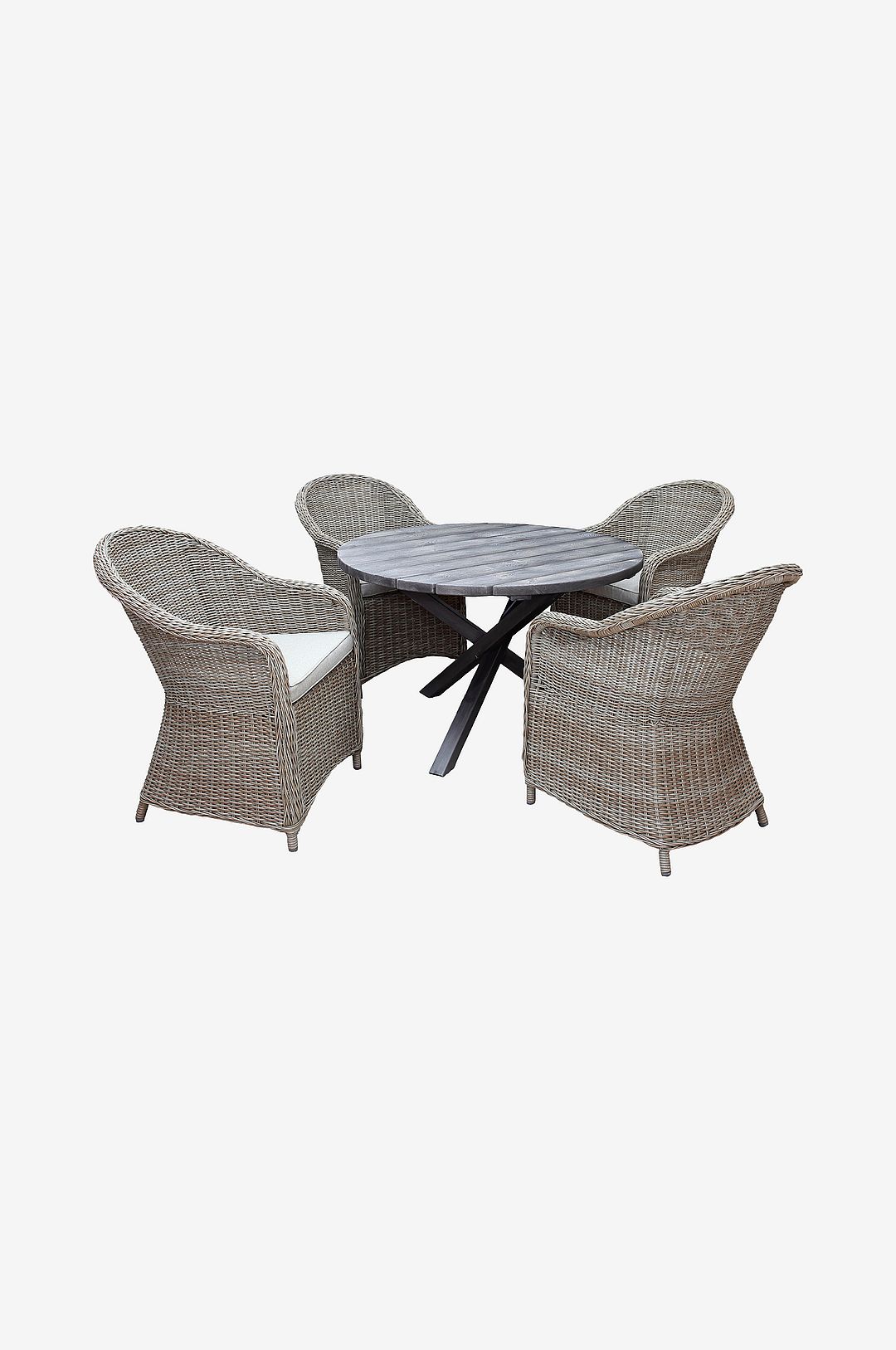 Ett modernt kombinerat trädgårdsmöbelset med ett runt bord i massivt trä med korslagda ben och fåtöljer i ljus rotting. Tillräckligt med plats för 4 personer.