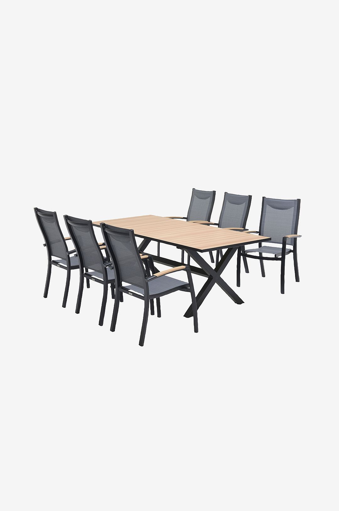 Matbord 200 cm med korslagda ben, rostfri stomme av aluminium och bordsskiva av aluminium med tryckt träeffekt. Bekvämt set med 6 stapelbara karmstolar av aluminium i svart färg med slipad effekt, armstöd med tryckt träeffekt och nackstöd i 3D-mesh. 100% underhållsfri.