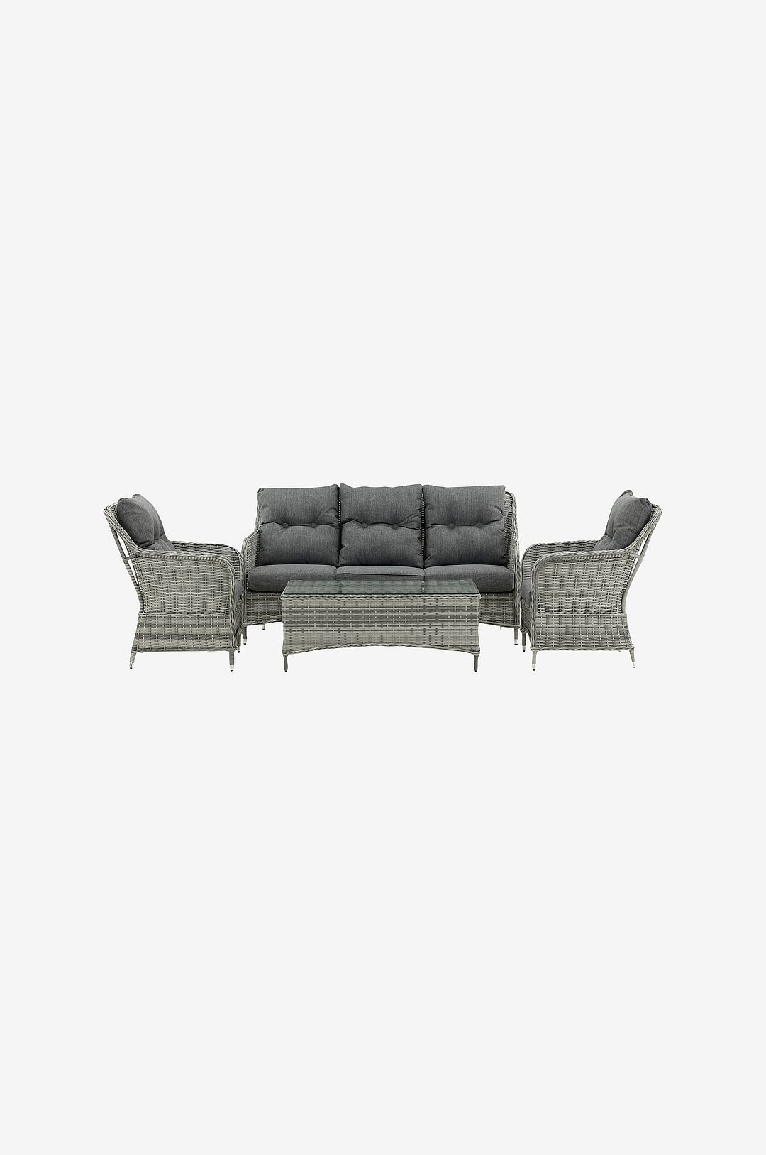 Vikelund är en exklusiv soffgrupp i bekväm utformning som kombinerar tidlös design med god komfort till din uteplats. Soffgruppen består av en tresits soffa, två karmfåtöljer inklusive mjuka, tjocka mörk pickerade dynor samt ett lägre soffbord med en bordsskiva i glas. Tillverkat i ljus konstrotting med en aluminiumstomme. Här kan du och dina gäster avkopplat njuta av sena sommarkvällar! Bord: Material Bordsskiva: Glas Material Bordsben: Aluminium, Konstrotting Längd: 113 cm Bredd: 63 cm Höjd: 46 cm Soffa: Material soffa: Konstrotting Material dyna: Polyester Bredd: 175 cm Djup: 79 cm Höjd: 92,5 cm Dynor medföljer.