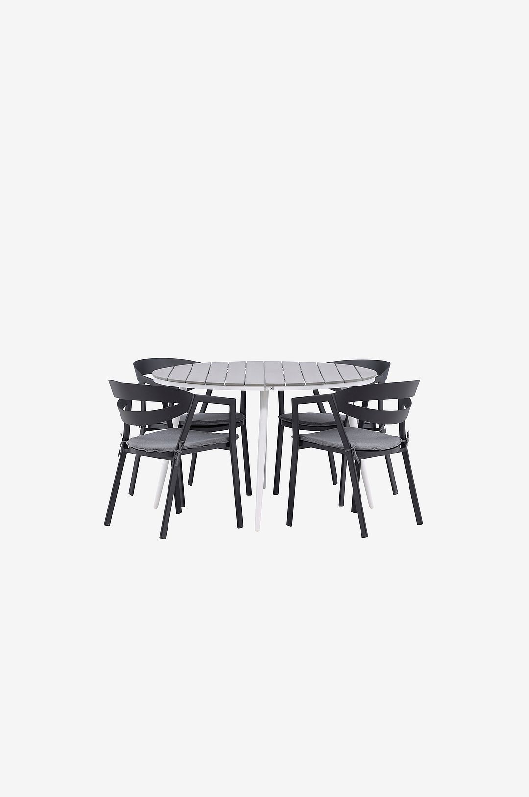 En rund matgrupp som kombinerar tidlös design med inbjudande former! Matbord Break har ett klassiskt utförande med en rund bordsskiva i aintwood och lätt utsvängda ben i aluminium. Här i perfekt kombination med bekväma matstolar från serien Slit. Stolarna har integrerade armstöd i aluminium och en dyna för extra komfort. Skapa den perfekta fikaplatsen på din altan! Bord: Material Bordsskiva: Aintwood Material Bordsben: Aluminium Diameter: 120 cm Höjd: 74 cm Stol: Material stolsben: Aluminium Material sits: Aluminium Material dyna: Bomull, Polyester Höjd: 76 cm Bredd: 59 cm Djup: 62 cm