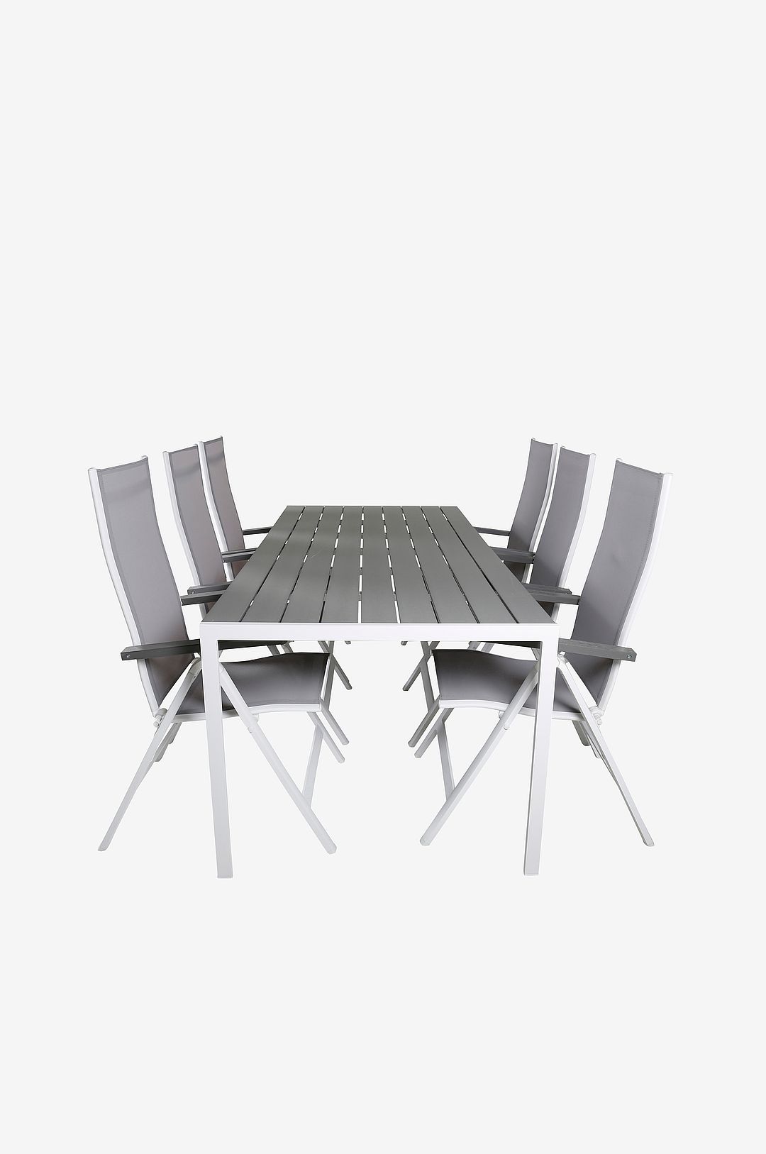 En läcker matgrupp i modern design! Matbord Break i klassisk stil är både trendsäkert och praktiskt. Här tillsammans med sittvänliga och fällbara matstolar i serien Albany. Samla familj och vänner och njut av varma sommarkvällar på uteplatsen! Bord: Material Bordsskiva: Aintwood Material Bordsben: Aluminium Längd: 205 cm Bredd: 90 cm Höjd: 74 cm Stol: Material stolsben: Aluminium Material sits: Textilen Höjd: 109,5 cm Bredd: 59 cm Djup: 67 cm