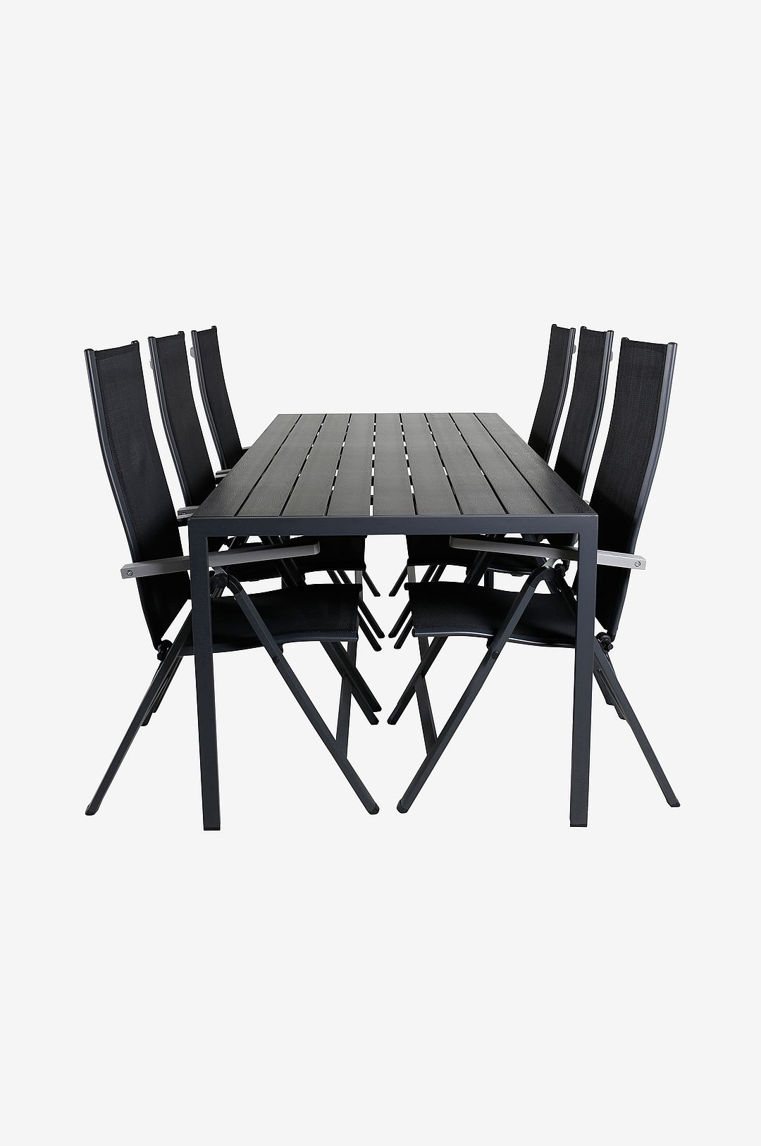 Gör dig redo för sommarens enastående uteliv med en bekväm matgrupp i läcker kulör. Matbord Break kombineras utmärkt med Venture Designs fällbara matstolar från serien Albany – justera ryggstödet för optimal komfort och sitt bekvämt i sommar! Bord: Material Bordsskiva: Aintwood Material Bordsben: Aluminium Längd: 205 cm Bredd: 90 cm Höjd: 74 cm Stol: Material stolsben: Aluminium Material sits: Textilen Höjd: 109,5 cm Bredd: 59 cm Djup: 67 cm