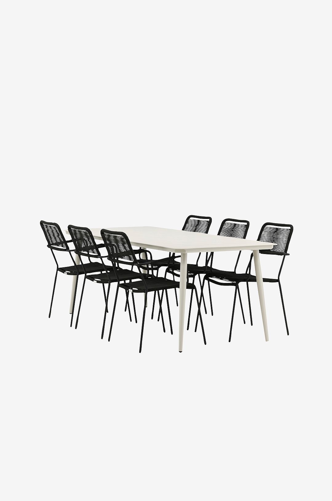 En modern kulör-matchning som skapar ett modemedvetet intryck i uterummet. Bordet lina har en minimalistisk design i stål, med en rektangulär bordsskiva och mjukt rundade kanter. Bordsbenen är lätt utsvängda och ger ett stadigt intryck. Mått: 200×90 cm. Här tillsammans med matstolar från serien lindos. Stolarna har stilrent smala ben och integreradermstöd i stål och en sits i slitstarkt rep. Bjud in till många trivsamma måltider framöver!