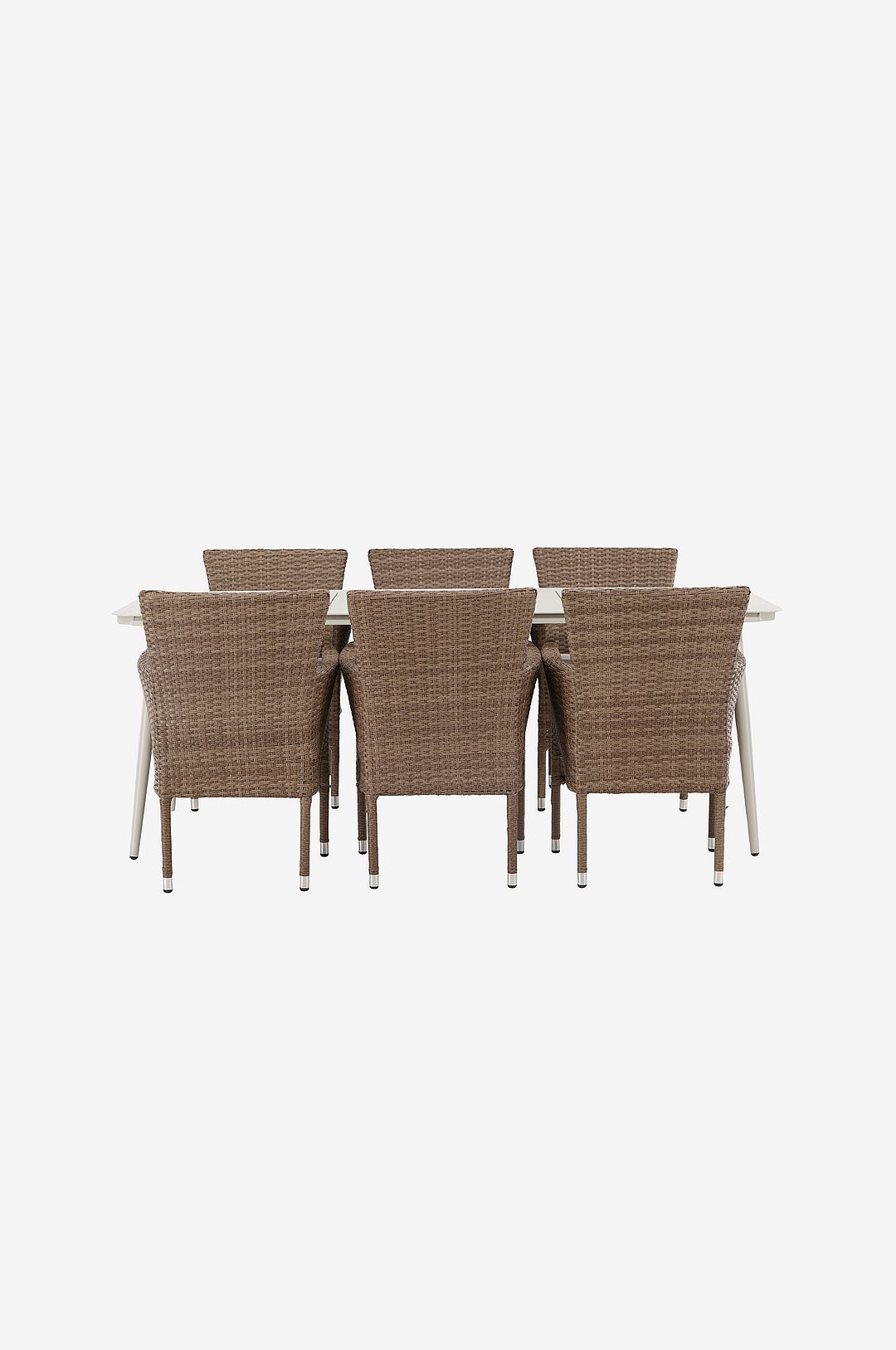 Den perfekta kombinationen av hög komfort och stilren design – den här matgruppen passar till alla tillfällen! Matbord lina har en rektangulär toppskiva i minimalistisk design och lätt utsvängda ben, genomgående tillverkat i stål. Här i läcker kombination med matstolar från serien malina. Stolen har en stomme i aluminium och konstrotting i en jordnära färg. Sitt bekvämt i sommar och njut av härliga måltider utomhus!