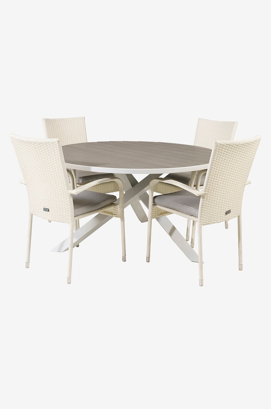Parma matbord med en rund bordstopp i konstträ och bordsben i aluminium. Matchas med 10st stapelbara matstolar Anna med stolsits i rotting och polyester och stolsben i aluminium. Bord och stol kräver enklare montering. Bordets mått: Diameter: 140 cm, höjd: 74 cm. Stolens mått: Sittbredd: 44 cm, sittdjup: 47 cm, sitthöjd: 44 cm.
