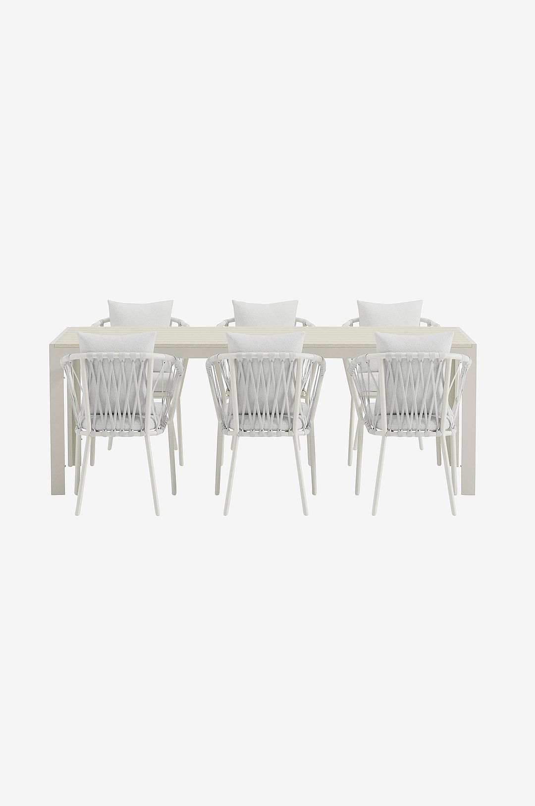 Skapa en elegant och inbjudande uteservering med denna harmoniska kombination av matstolarna linos och det moderna matbordet mirko. Matstolen linos erbjuder en exklusiv blandning av komfort och stil. Den beige vävda ramen ger ett luftigt och sofistikerat utseende, medan de mjuka vita bouclé-dynorna ger exceptionell komfort – perfekt för långa middagar och sociala stunder. En stol som tillför värme, karaktär och tidlös elegans till ditt utomhusutrymme. Mirko matbord är ett rymligt och modernt bord i elegant beige. Den rektangulära formen och den robusta aluminiumramen gör det både snyggt och hållbart, medan bordsskivan i polywood ger en naturligt varm känsla. Bordet erbjuder gott om plats för hela sällskapet och blir snabbt en naturlig samlingspunkt på uteplatsen eller i trädgården.