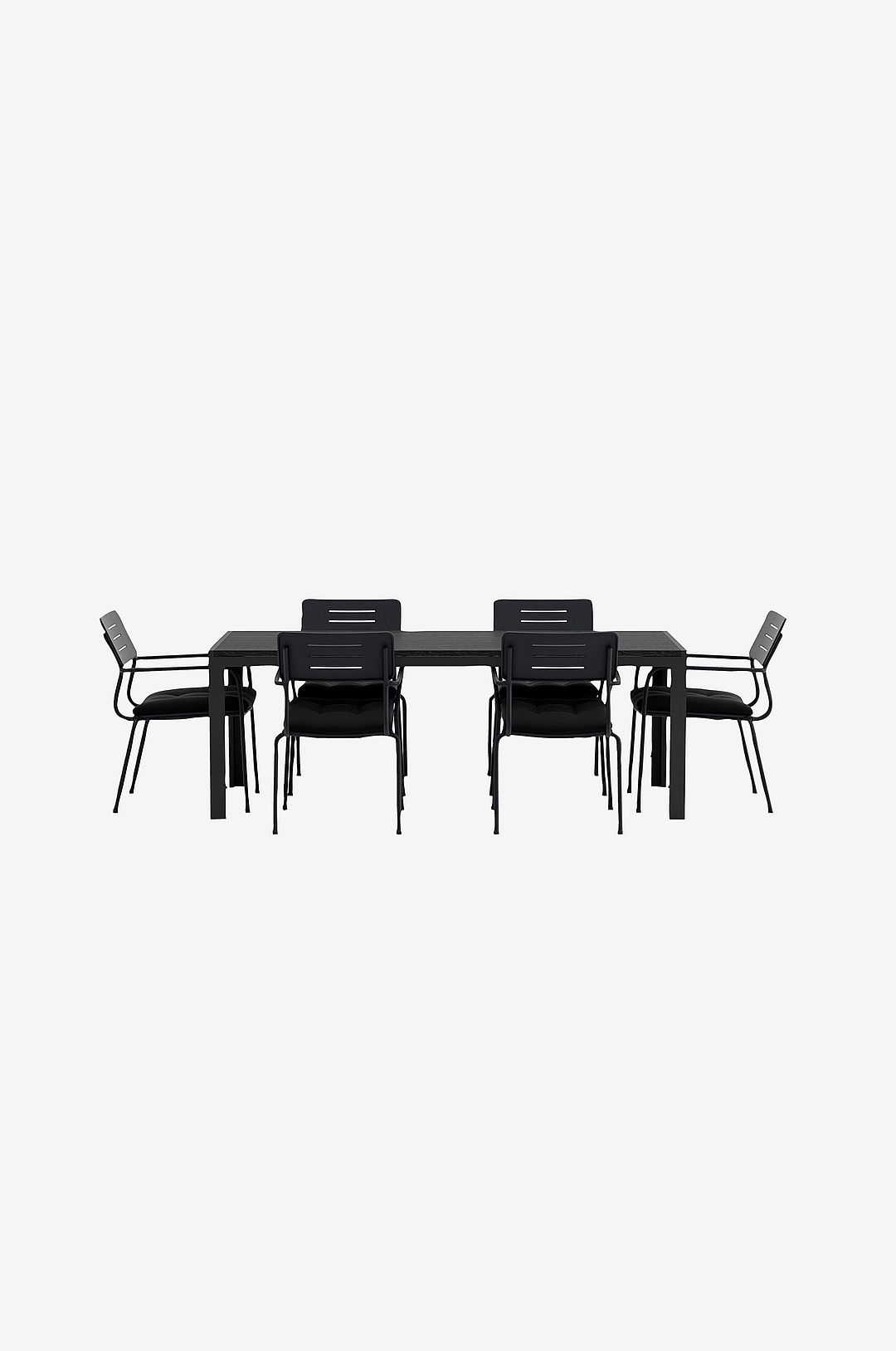 Skapa en snygg och inbjudande uteplats med denna eleganta matgrupp som kombinerar det moderna mirko-bordet med sex stapelbara nicke-stolar – perfekt för sommarmåltider och sociala stunder utomhus. Nicke-stolen är en slimmad och enkel stol i svart stål som fungerar lika bra på uteplatsen som i uterummet. Den smala och lättplacerade designen gör stolarna enkla att ställa upp och de kan enkelt staplas när de inte används. Perfekt att kombinera med ett modernt matbord för en harmonisk och funktionell utemiljö. Mirko-bordet är det perfekta valet för alla utomhusutrymmen. Med sin eleganta svarta färg och rektangulära form skapar bordet en modern och fräsch känsla på din uteplats. Den rostbeständiga aluminiumramen gör bordet både stabilt och lätt, medan bordsskivan i polywood ger en naturlig och varm karaktär. Den generösa storleken ger gott om plats för hela gruppen – perfekt för både måltider och trevliga sammankomster.