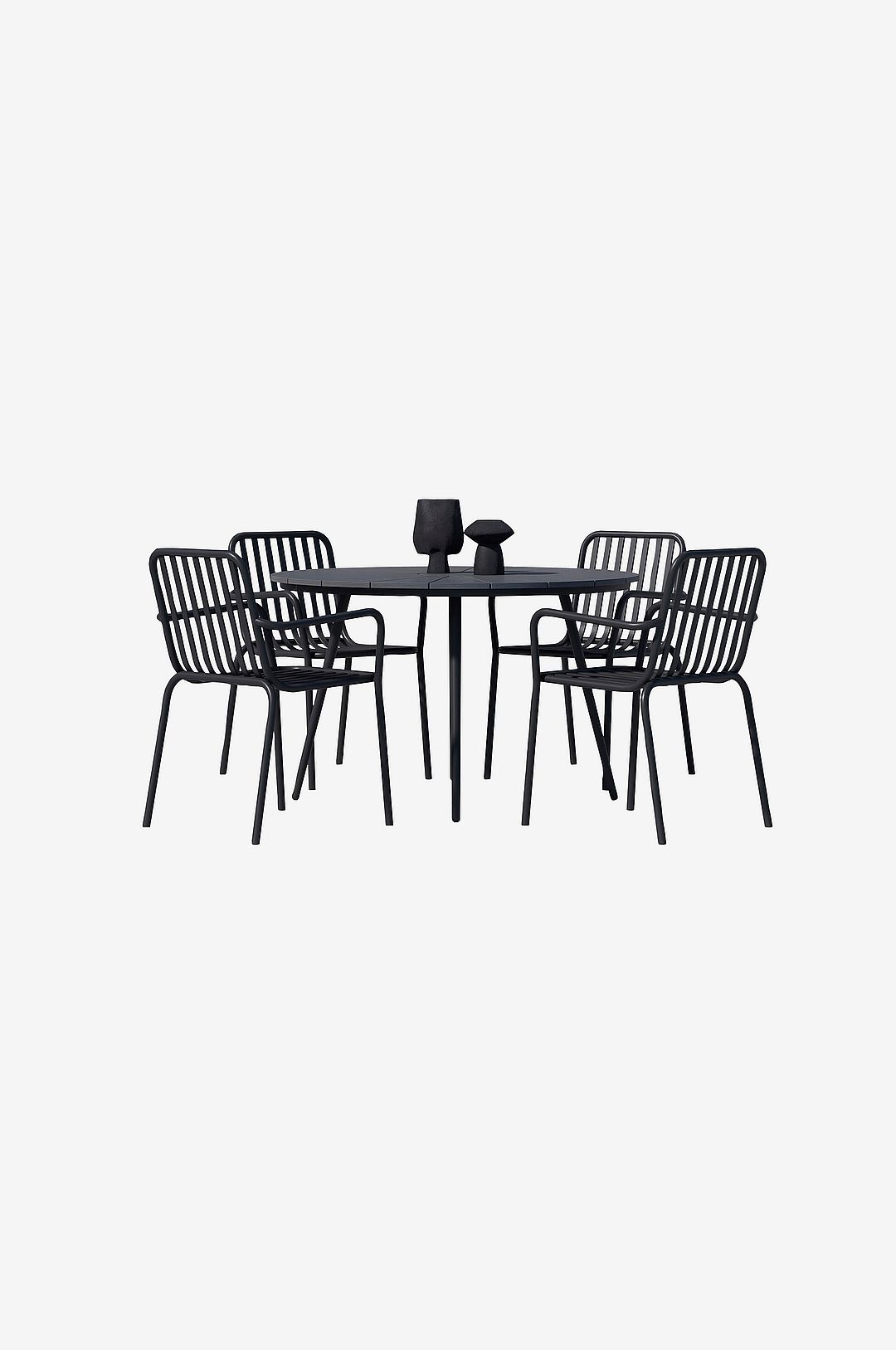Skapa en elegant och inbjudande matplats utomhus med matgruppen san vito, som består av det eleganta runda matbordet san vito och fyra moderna matstolar peking. Kombinationen av svart aluminium och plywood ger en sofistikerad och tidlös känsla, vilket gör att den passar perfekt för terrassen, uteplatsen eller trädgården. matbordet san vito har en generös diameter på 120 cm, vilket ger gott om utrymme för att samla familj och vänner för härliga måltider. Bordet är tillverkat av slitstark aluminium med en vacker bordsskiva av plywood, vilket ger en perfekt balans mellan stabilitet och lätthet. Den djupa svarta färgen förstärker det eleganta uttrycket och gör bordet till en raffinerad fokuspunkt i ditt utomhusutrymme. peking dining chair är en modern och tidlös stol som kombinerar funktionalitet med stil. Den räfflade designen och den djupa svarta färgen skapar ett sofistikerat utseende, medan den robusta aluminiumramen gör stolen både lätt och väderbeständig. De integrerade armstöden ger extra komfort, och tack vare den stapelbara designen är stolen lätt att förvara när den inte används. med matsetet san vito får du den perfekta kombinationen av design, komfort och hållbarhet, vilket gör varje måltid till en oförglömlig utomhusupplevelse. En elegant matgrupp som lyfter ditt utomhusutrymme till nästa nivå!