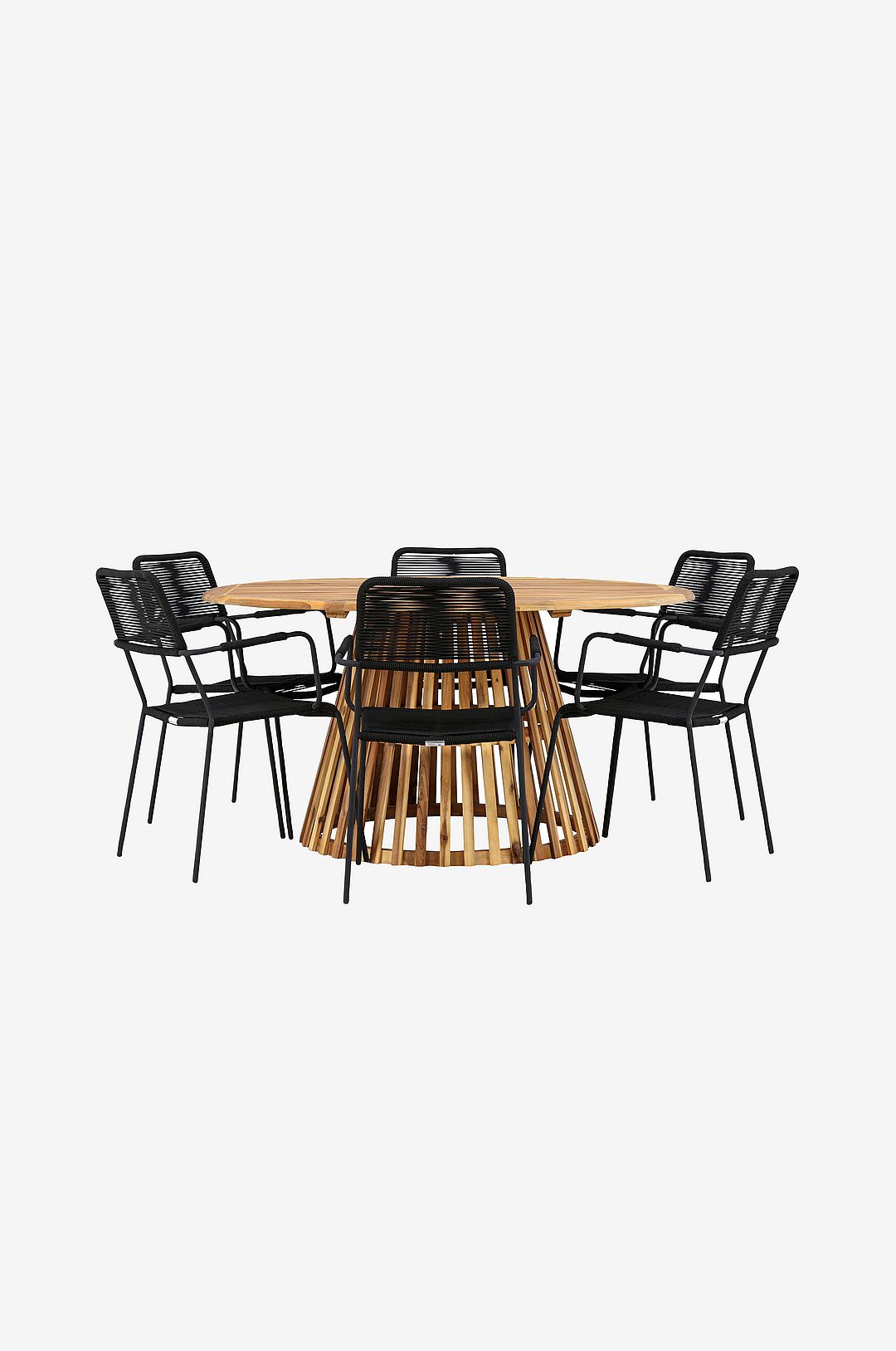 Upptäck den perfekta matgruppen för din utomhusmiljö med det eleganta bordet tucumán och de snygga stolarna lindos. Med en imponerande diameter på 120 cm erbjuder bordet tucumán gott om plats för familjemiddagar och trevliga sammankomster under bar himmel. tucumán -bordet är tillverkat av akaciaträ och ger en naturlig och inbjudande känsla till ditt utomhusutrymme. Dess naturliga färg smälter harmoniskt in i omgivningen och skapar en fridfull atmosfär där du och dina gäster kan koppla av och njuta av utsökta måltider. Stolarna lindos är tillverkade av aluminium, vilket garanterar hållbarhet för utomhusbruk. Stolarnas eleganta färg ger en sofistikerad touch till din uteservering och kompletterar bordets naturliga träfärg på ett elegant sätt. Denna matgrupp levereras komplett med sex bekväma stolar, perfekt för avslappnade måltider och sociala sammankomster utomhus. Med matgruppen tucumán och lindos kan du skapa en inbjudande och elegant utomhusmiljö där din familj och dina gäster kan njuta till fullo.